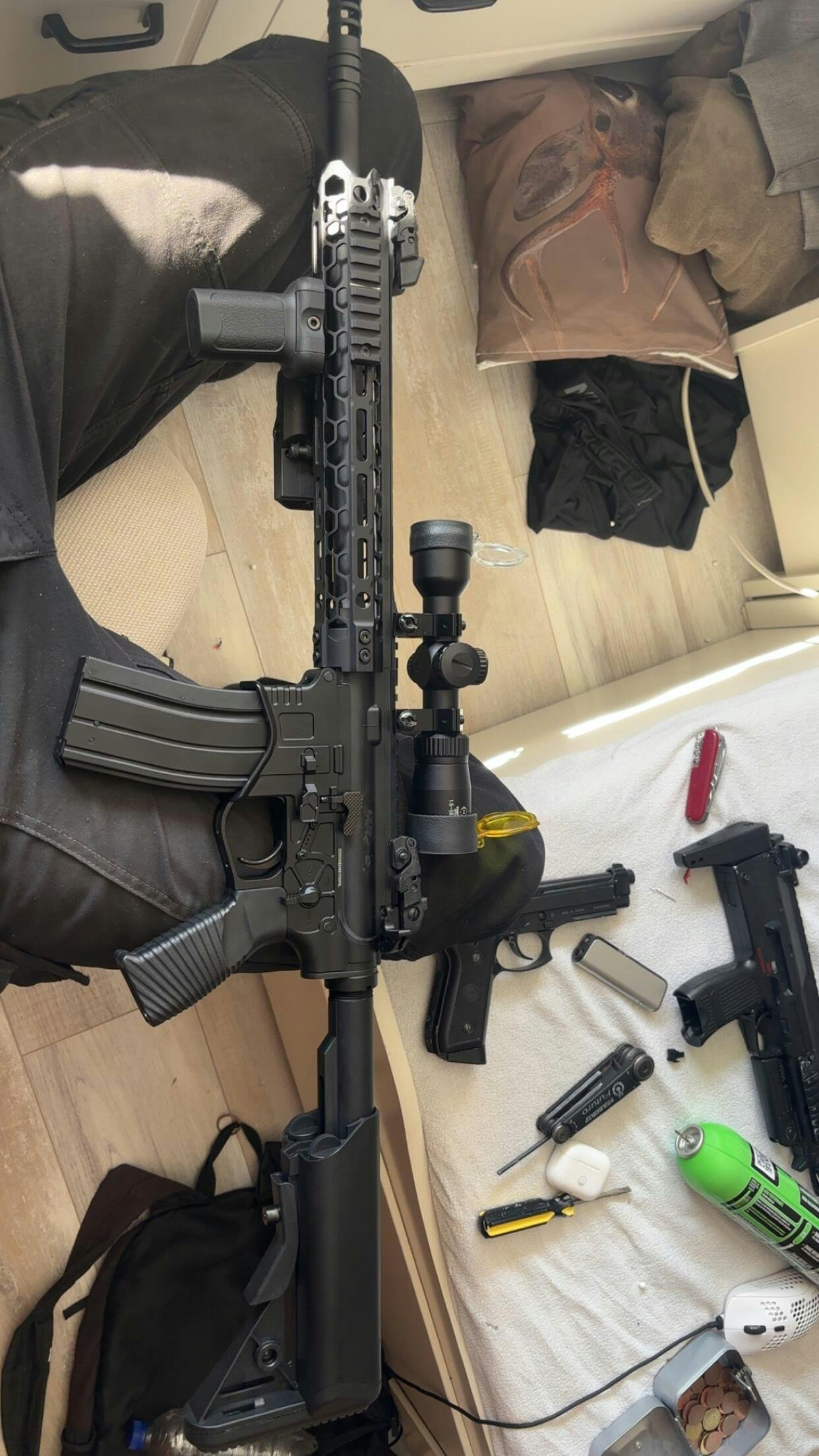 Full Auto Airsoft guns exceeding 0.5 joules are considered firearms under the Weapons Act. Carrying them without a valid firearms license (with the "F in a pentagon" marking) is an administrative offense.